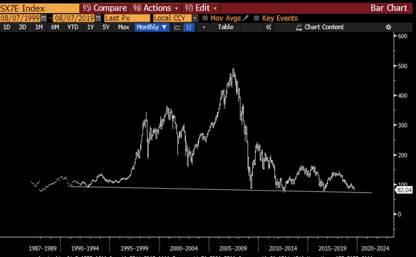 Indeed, below is a chart of a European bank index, which shows that these financial institutions are trading at levels not seen since 1993.